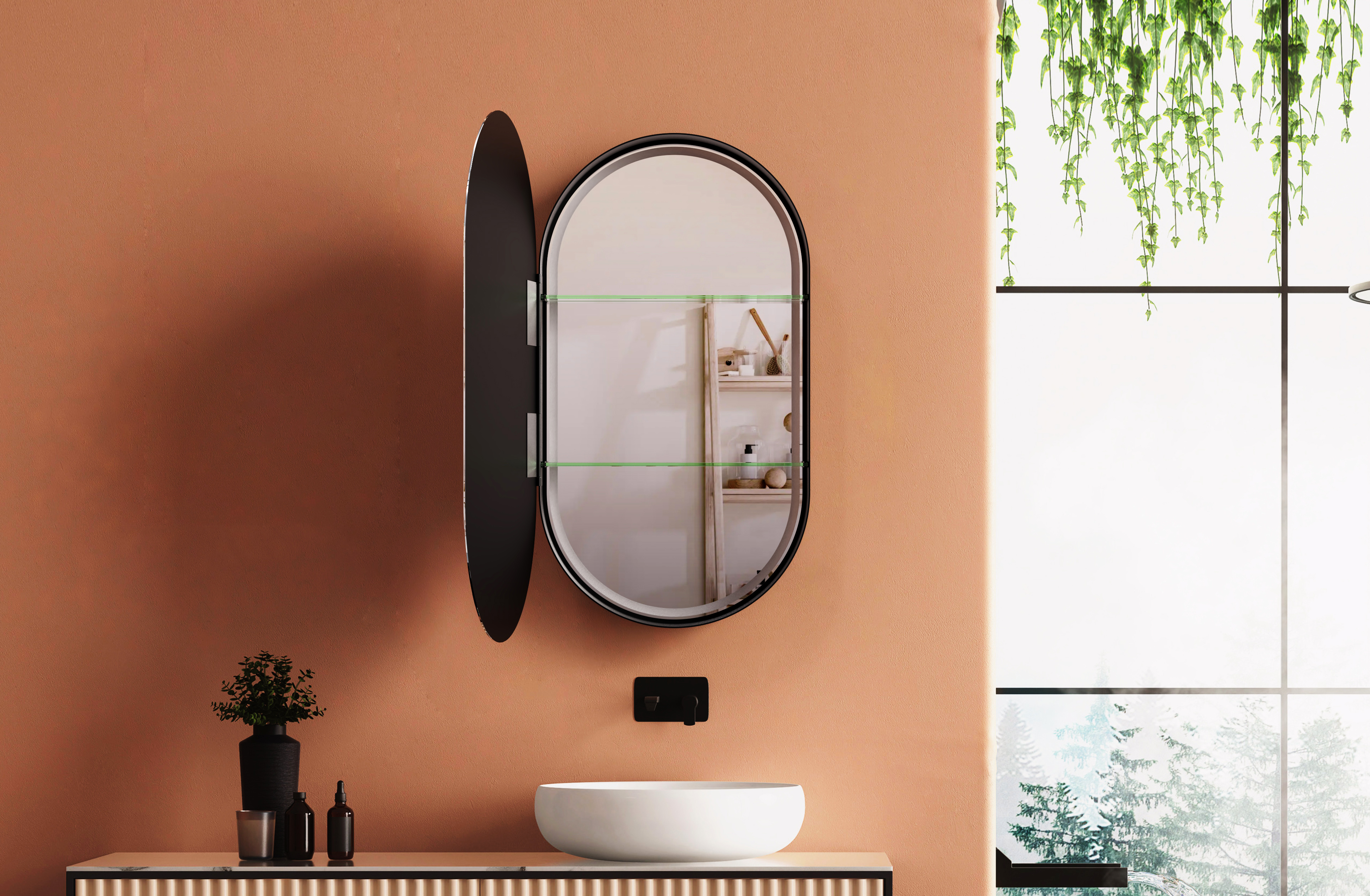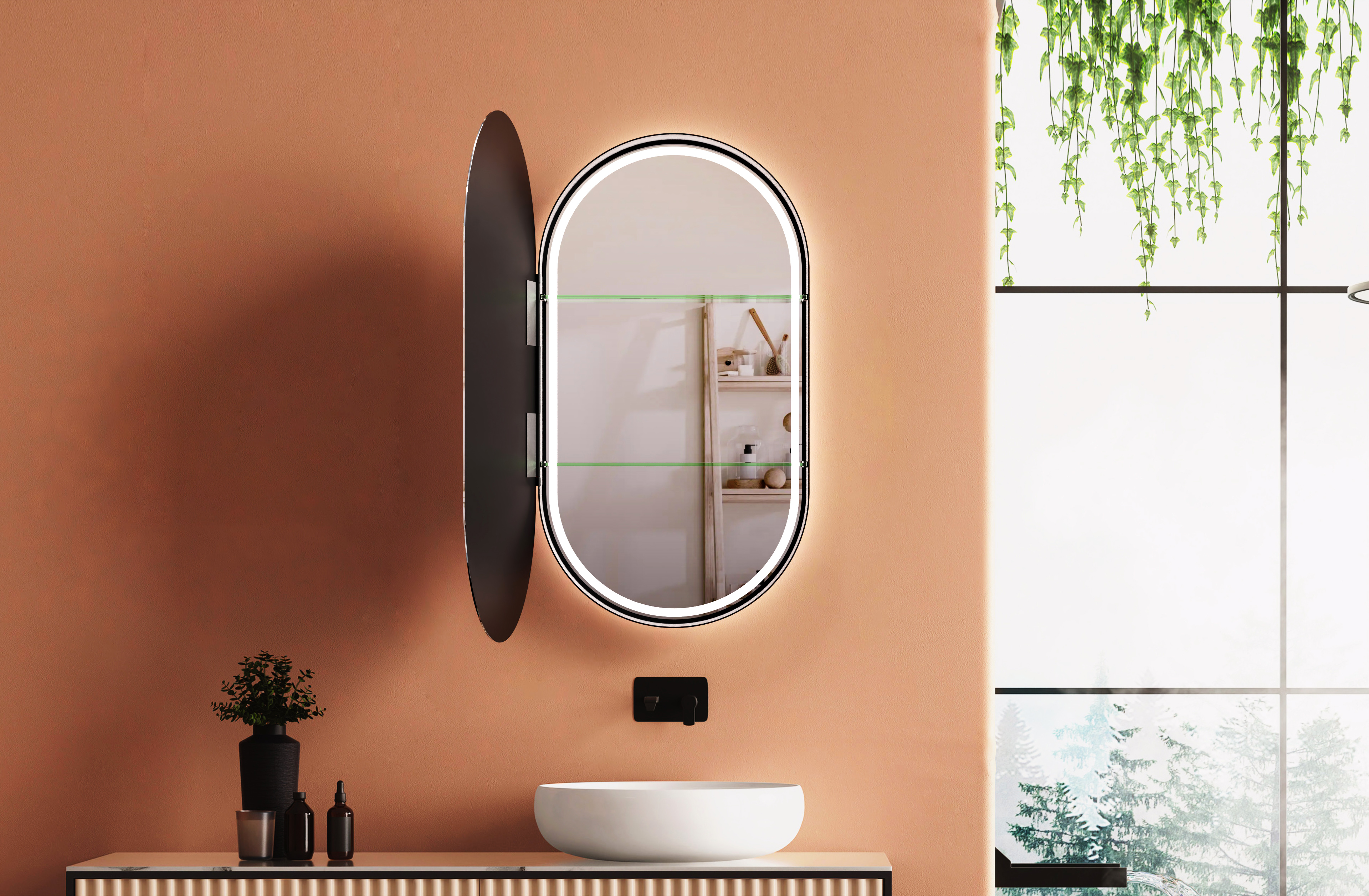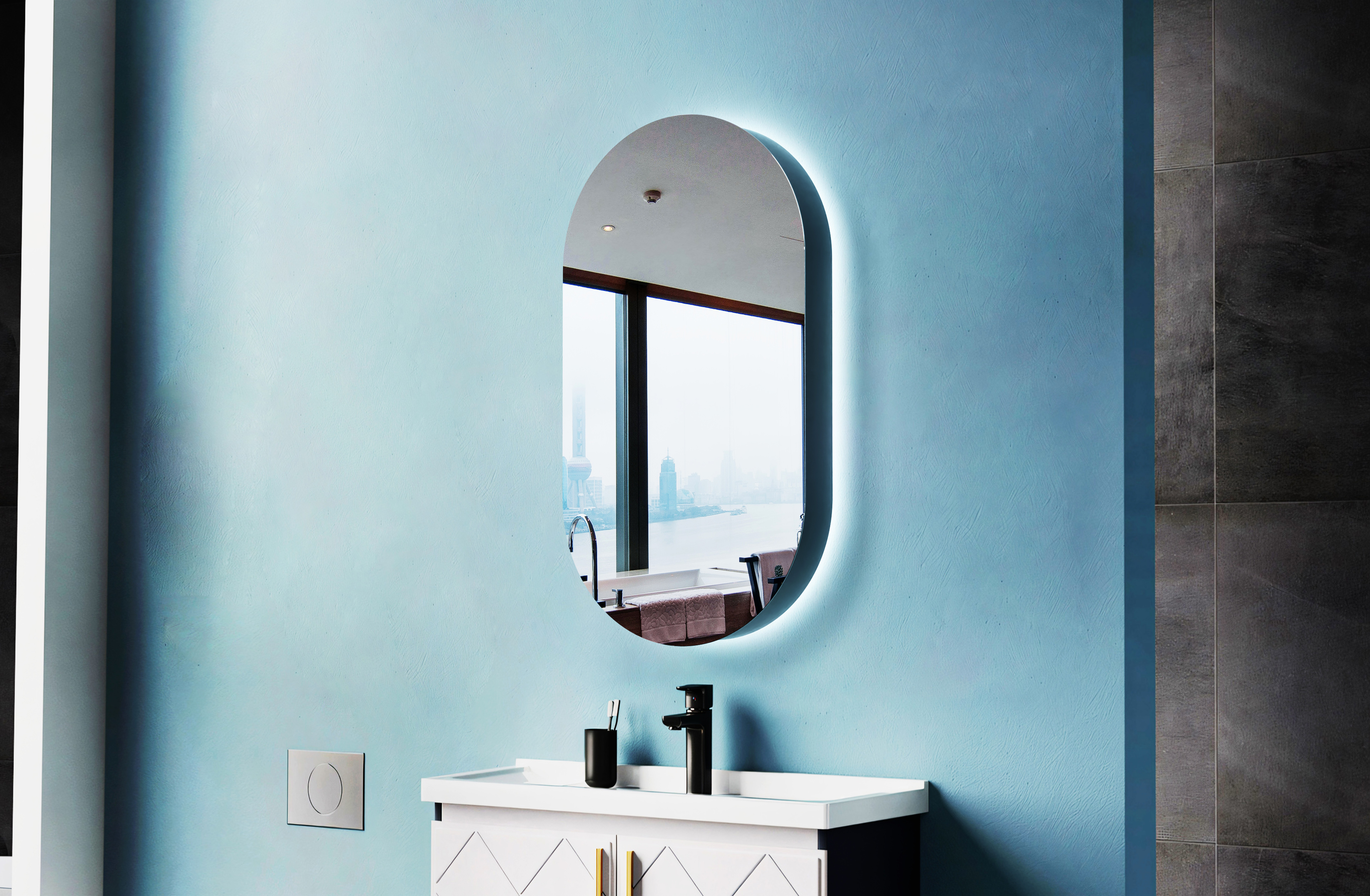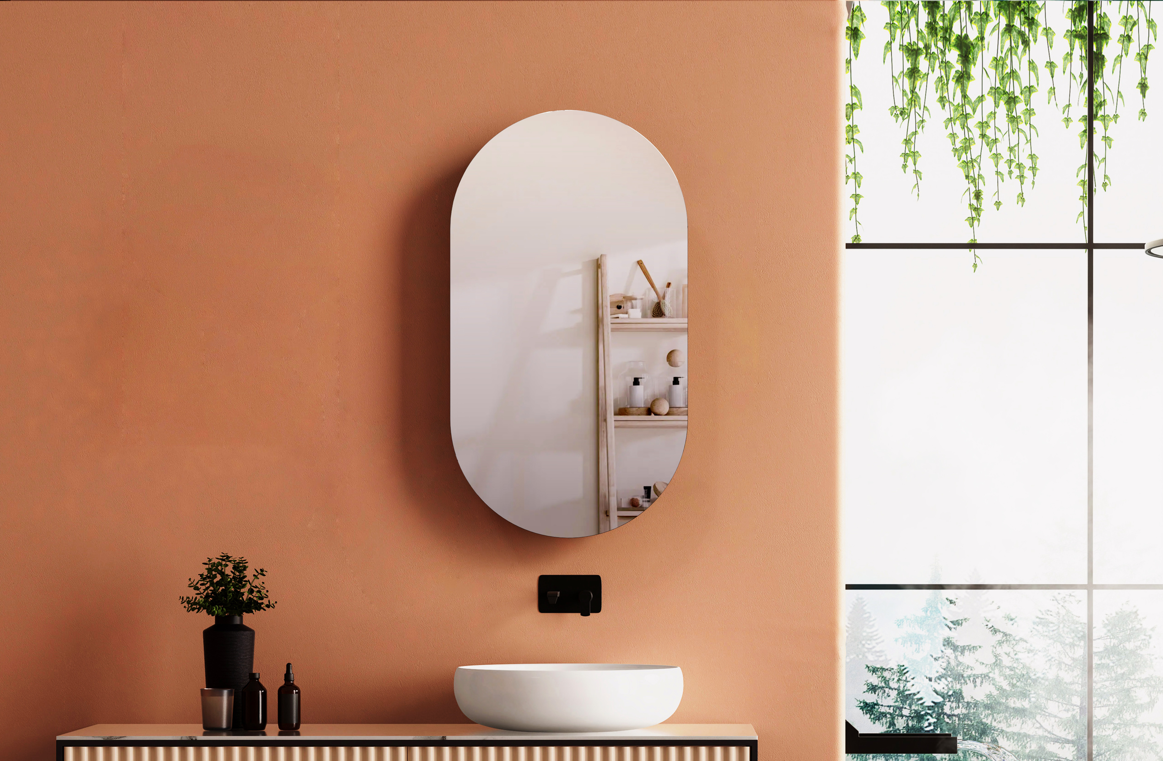 Den ovale form giver spejlskabet et blødt og enkelt udtryk, der passer ind i både små og større badeværelser. Det integrerede lys ligger jævnt langs kanten og giver spejlet en svævende effekt på væggen.