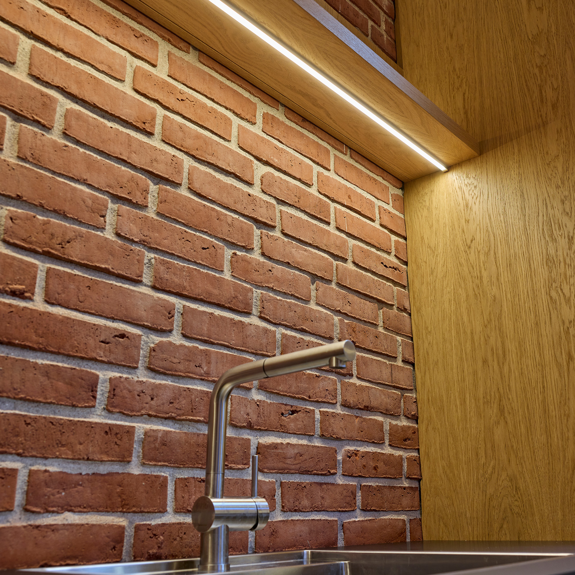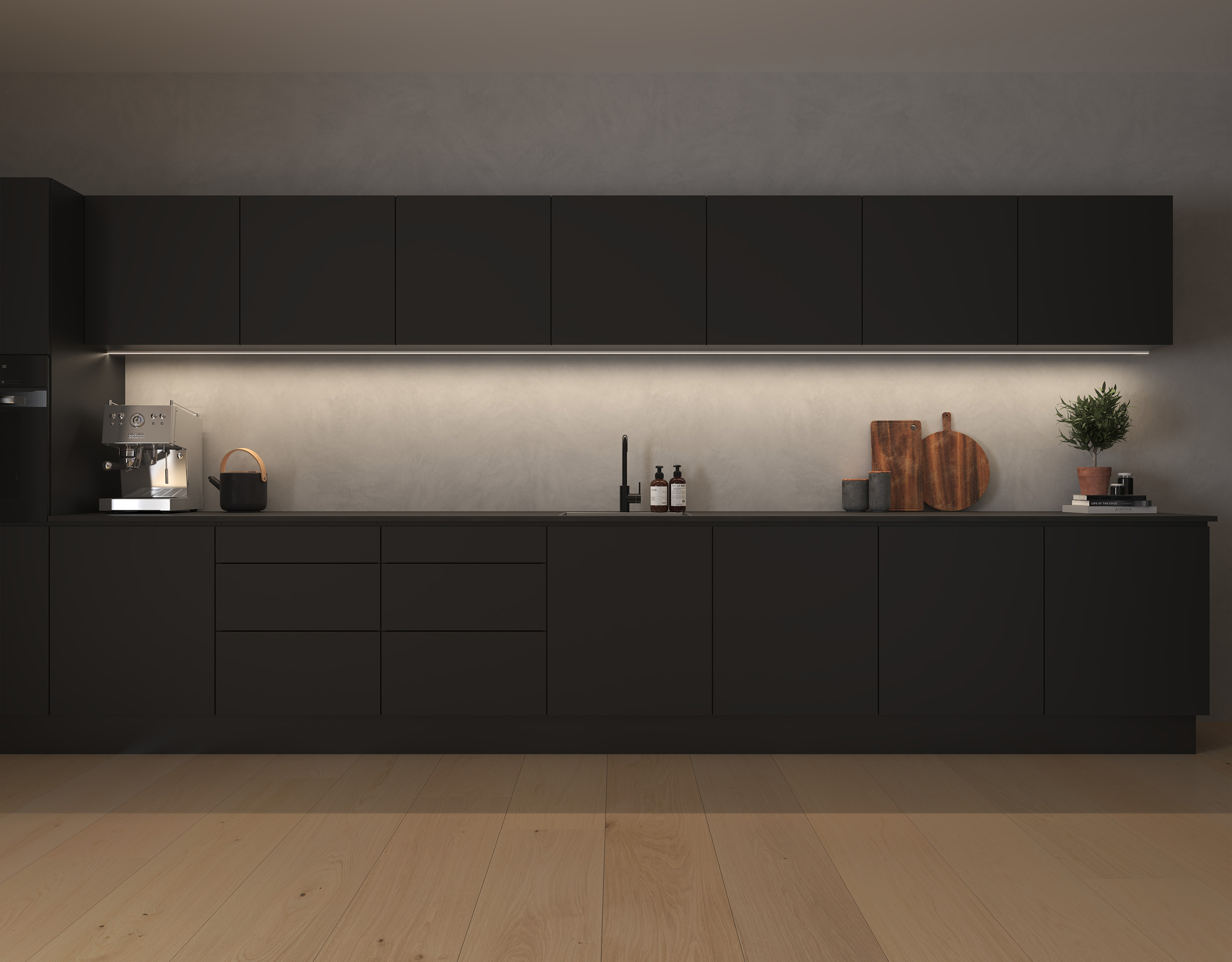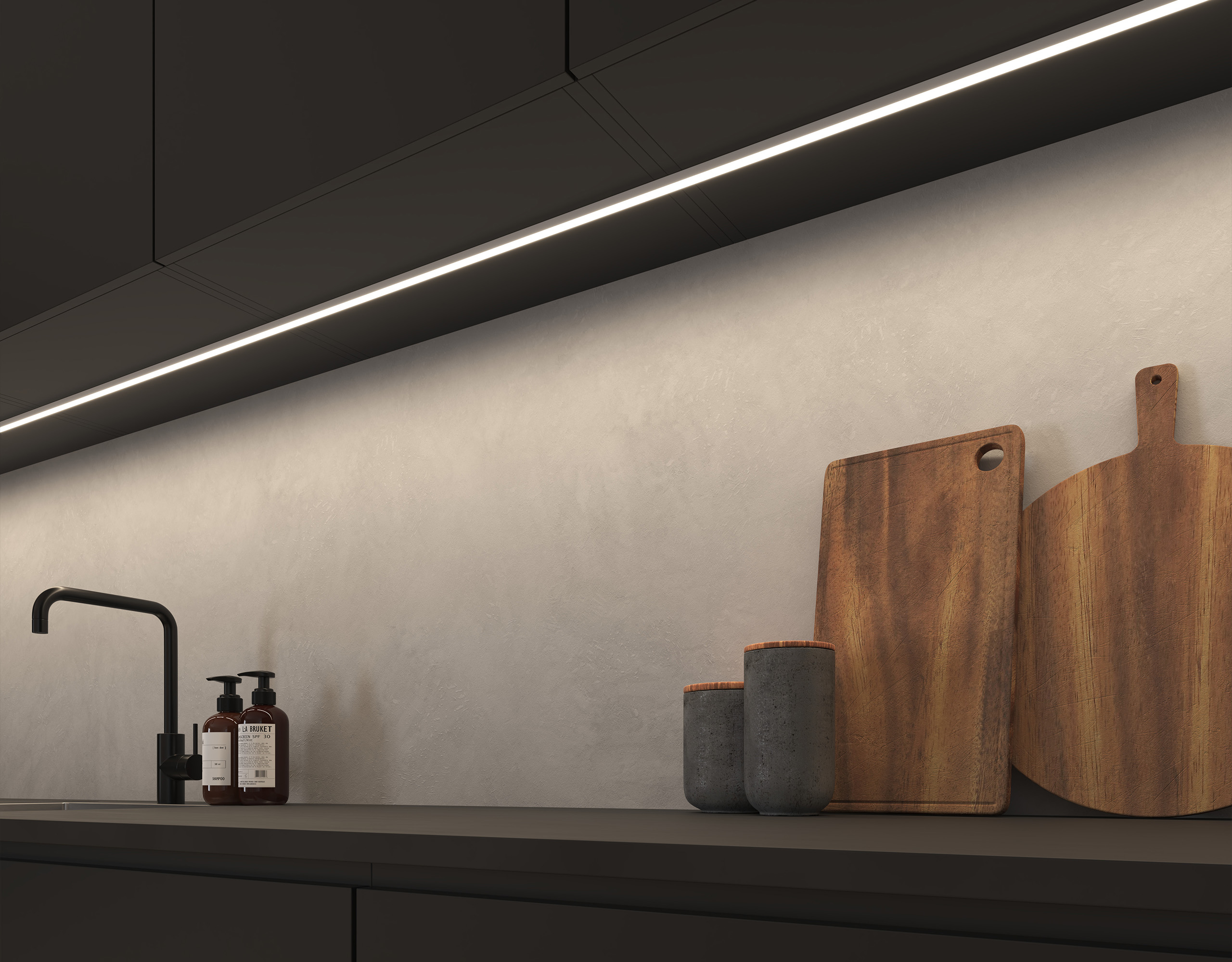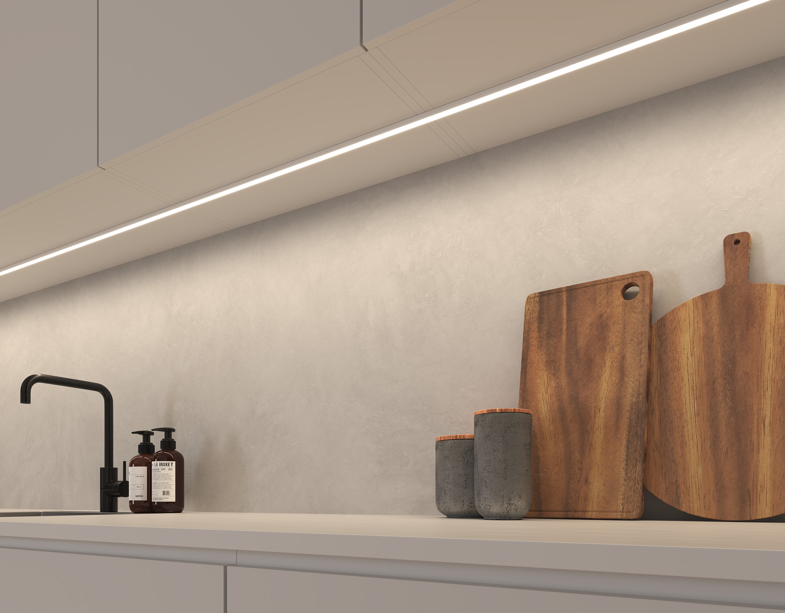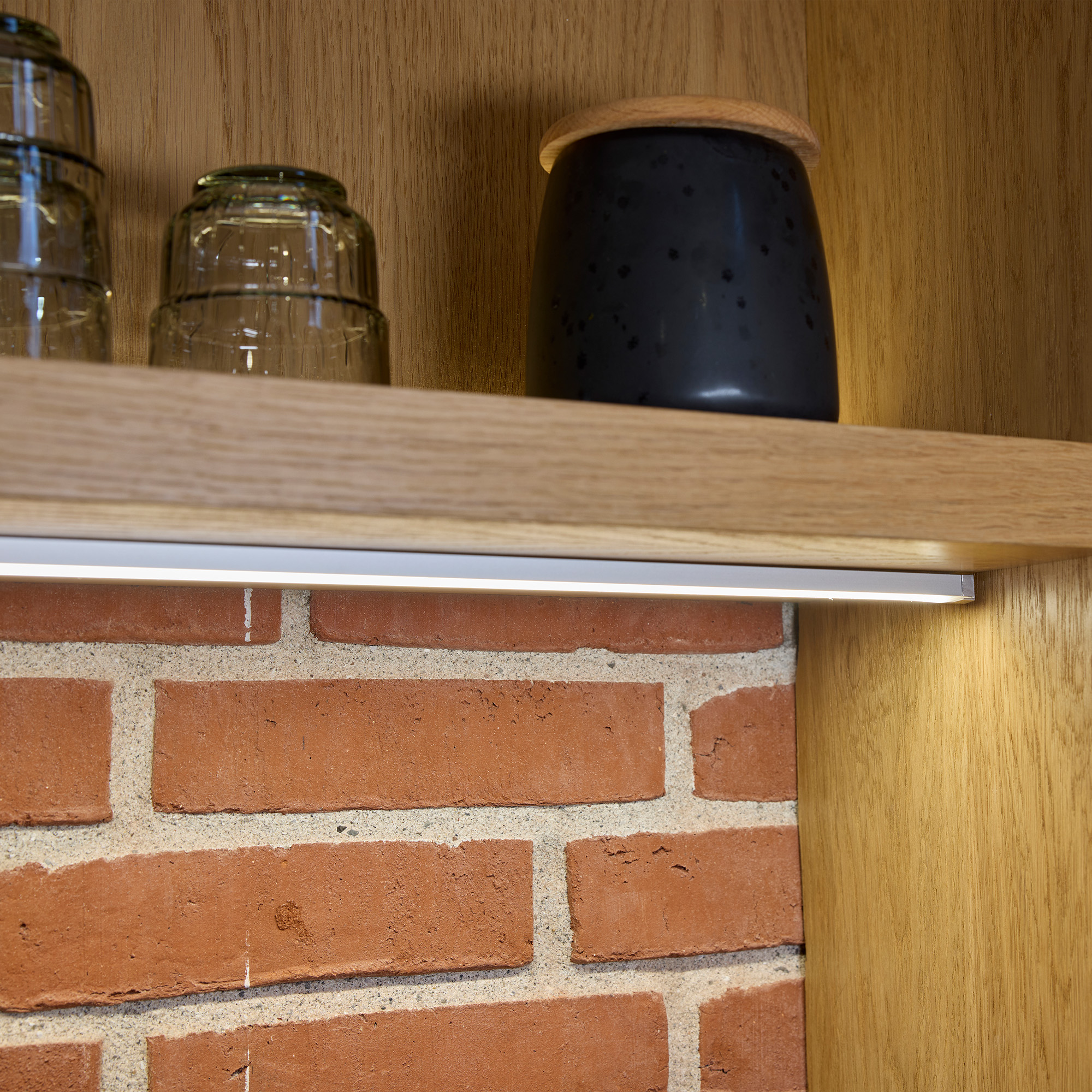 Lineært lys giver et smukt ensartet lys på hele overfladen. Brug LEDconnect under skabe eller hylder. LEDconnect kan nemt eftermonteres, da lyskilden placeres på overfladen. Systemet tilpasses nemt, så du får præcis den længde, du har brug for.